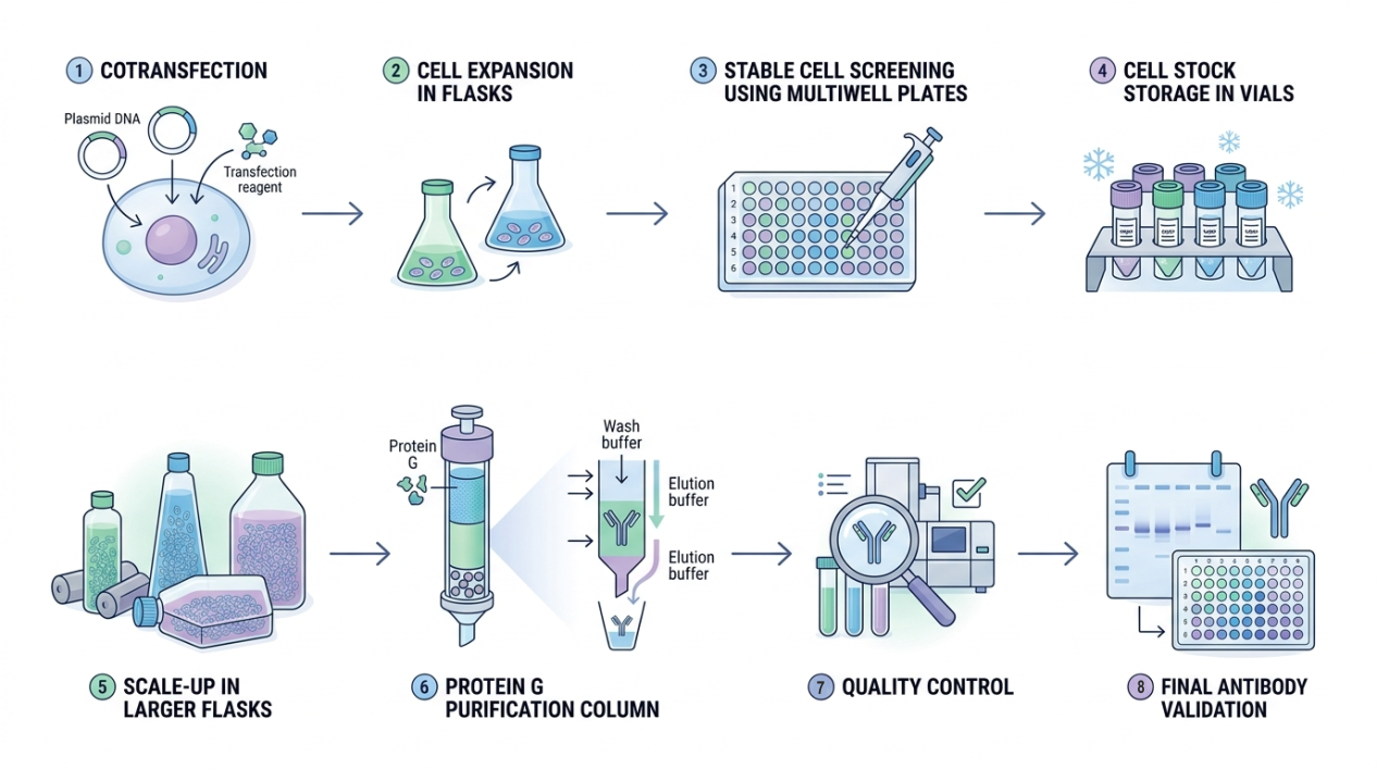 The production of recombinant antibodies involves in vitro manipulation of antibody genes. Specifically, the genes encoding the heavy and light chains are cloned into expression vectors, which are then introduced into suitable host cells for protein expression. Commonly used host systems include mammalian cell lines such as CHO and HEK293. Alternative approaches, such as phage display and lentiviral expression systems, are also widely employed. Although mammalian cells are the preferred choice for producing functional recombinant antibodies, other systems including bacterial, yeast, and insect cell lines can also be used depending on the application.